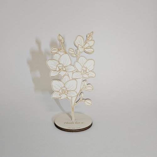 Lasersko gravirana in izrezana orhideja za materinski dan, dan žena ali valentinovo. Na podstavek se lahko vgravira krajši napis ali personalizirano misel, lahko pa izberete med že obstoječimi napisi.