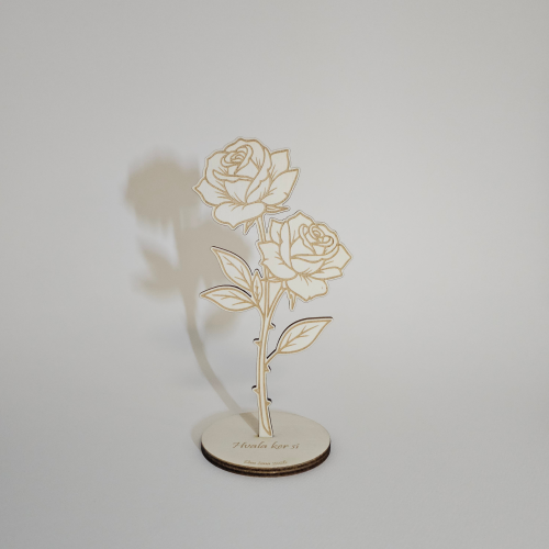 Lasersko gravirana in izrezana vrtnica za materinski dan, dan žena ali valentinovo. Na podstavek se lahko vgravira krajši napis ali personalizirano misel, lahko pa izberete med že obstoječimi napisi.